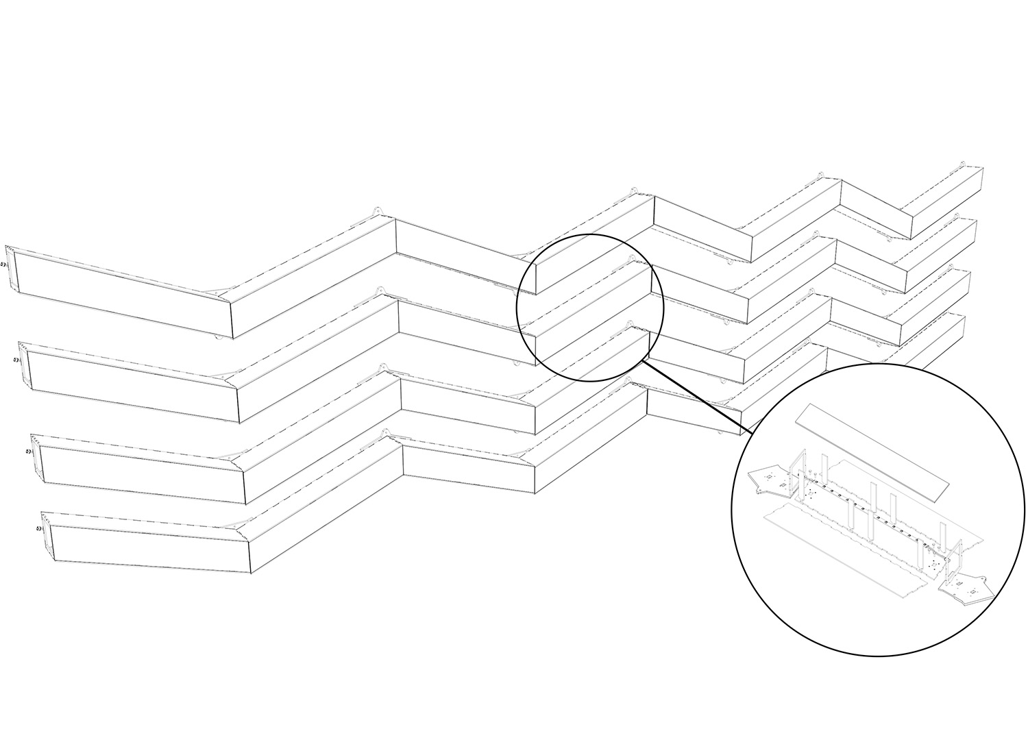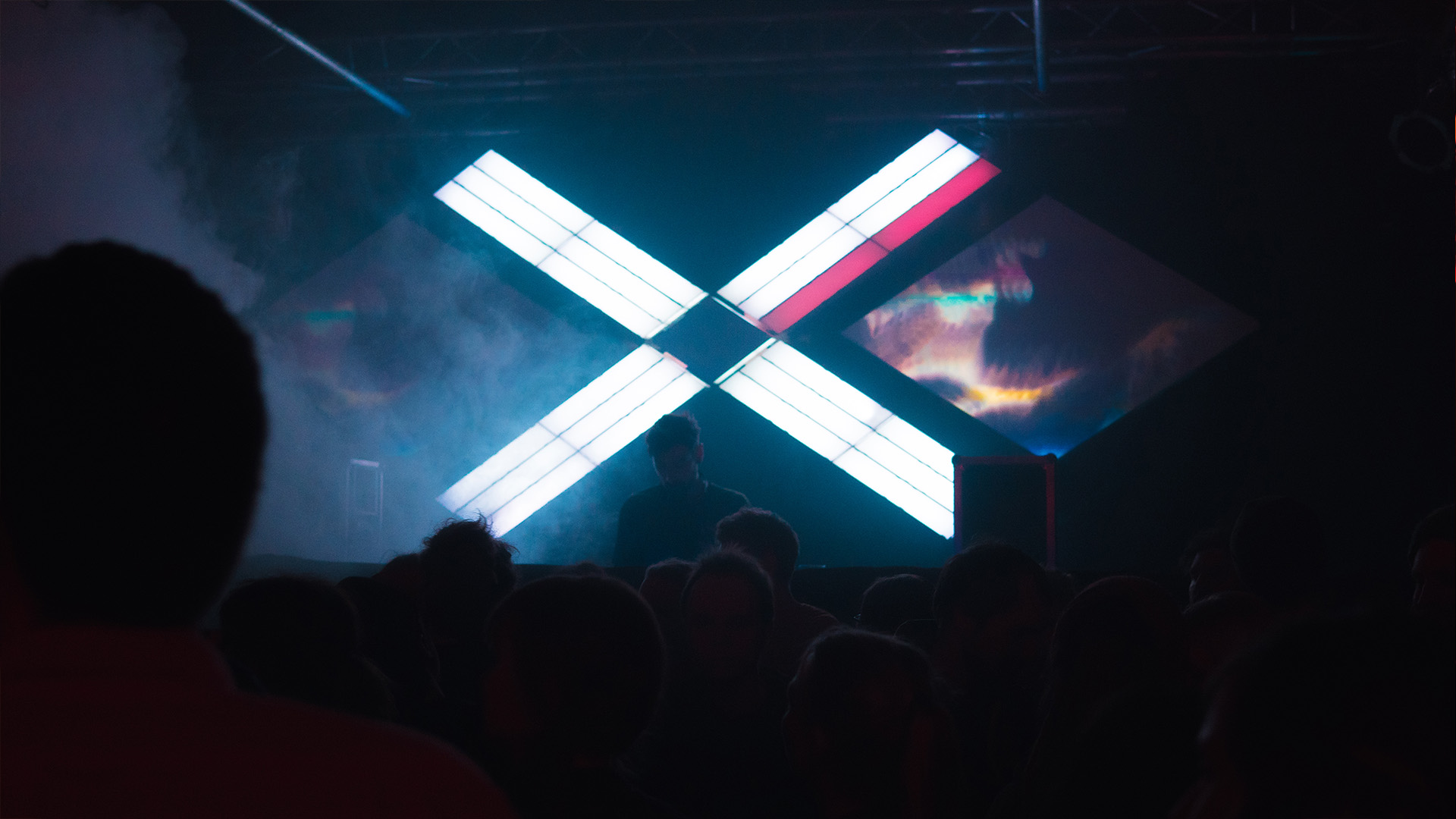 The setup is composed of four diagonally running groups of elements, which converge towards the centre on a stroboscope in the shape of a rhombus. The lights are extended by two screens, also in the shape of a rhombus, on which live visuals are projected. The setup was used for various performances at the "EXIT" event series. The arrangement is based on the logo of the crew.