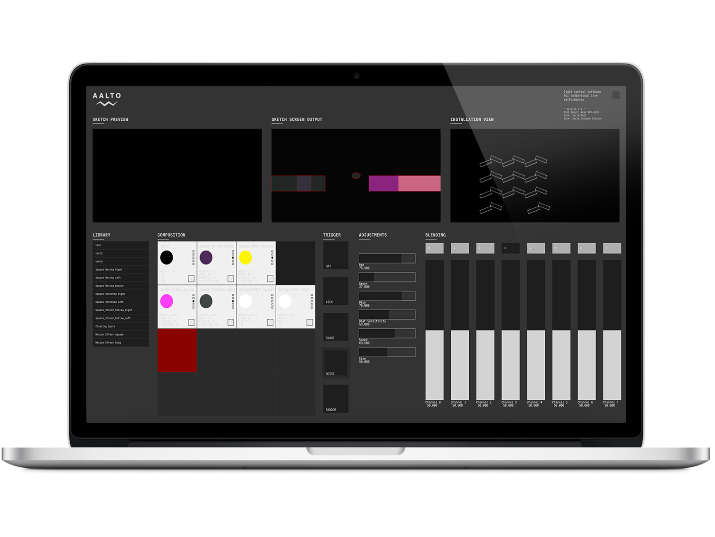 The main problem with video content or processing sketches is that they cannot be easily transferred to larger LED installations. The created software gets rid of this problem. It can import those sketches or video files and interpreted them as effects that can be combined or manipulated via the interface and are outputted on the LED Bars.The Interface views are splitted in four different parts. The left one is an preview of the selected effect. The middle view is a raw visual impression of all active effects. The right view is a simulation of the current state of the installation. It can be controlled with common MIDI Interfaces.