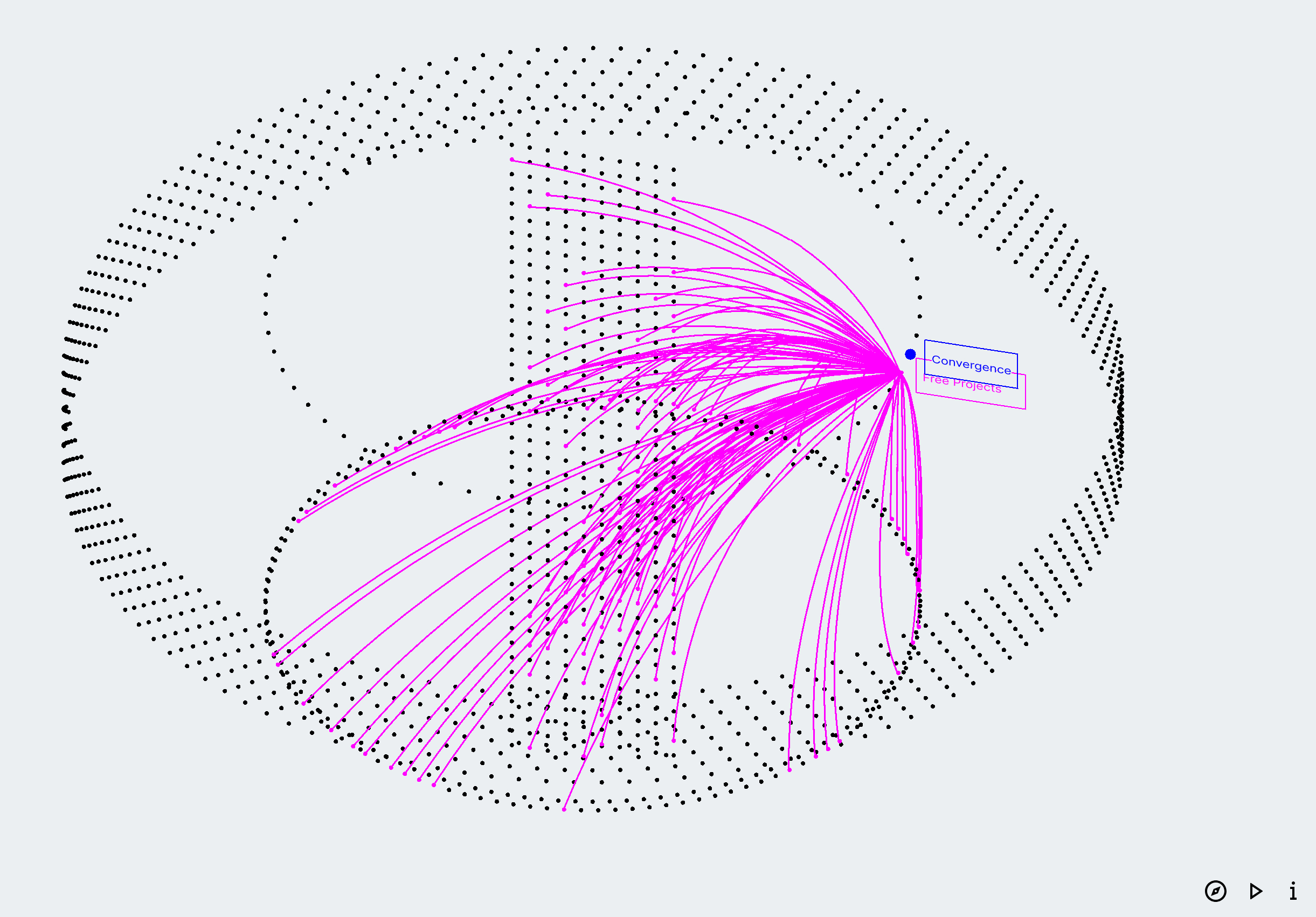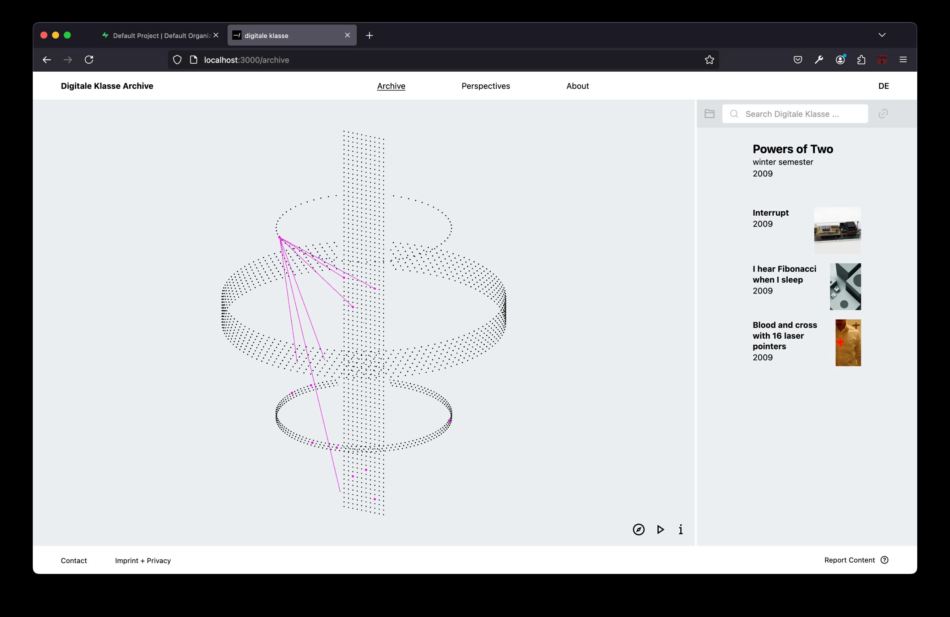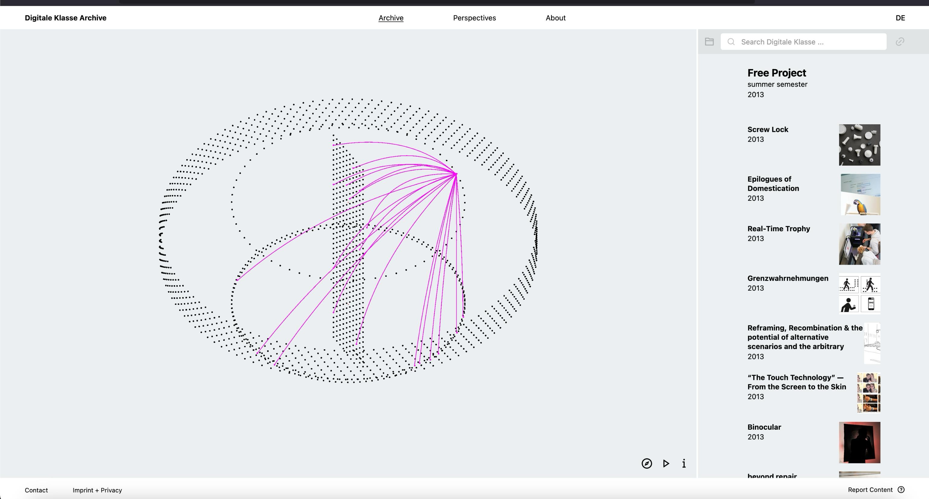 Based on the dataset collected from the archive of the former “digitale klasse” of Joachim Sauter at UdK, a web-based interactive data visualization was created. The aim was not only to highlight context-based data networks but also to reveal the interconnections between the metadata of the individual entries. It includes more than 1,000 records of projects, artifacts, and publications spanning nearly 30 years of the “Digitale Klasse.”The current state of metadata indexing has been made available as open source and is expected to be published as an independent, open, interactive 3D web-based data visualization by the end of 2025. It is powered by a custom-built engine based ontop of P5.js.