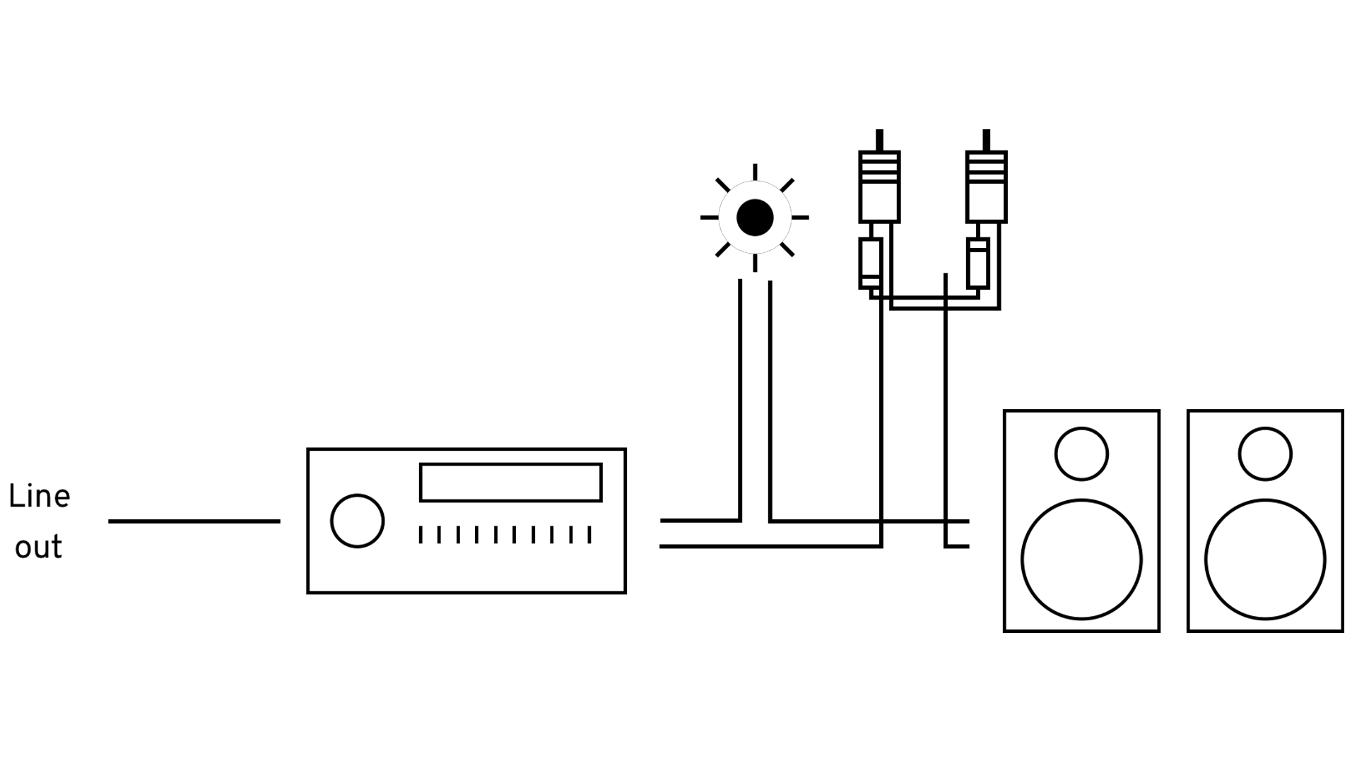 The technical motivation of this work represents a mutual influence of auditory as well as visual content. In other live visualizations of sound, the audio stream is tapped in parallel after output and an abstraction is presented in visual form based on this. Here, no interaction between auditory and visual content is formed, but only the sound determines the adaptation of the visuality. However, by a small adjustment of the structure it is possible to enable mutual influence. In contrast to the previously shown setup, the visual content is switched in series before the output after amplification by an amplifier. This means that the amplified audio signals must flow through the visual output once and drive it. As the visual output influences the auditory signal and adapts, distorts or generates completely new sounds based on the visual state. This is only possible after amplification by a conventional amplifier, since the general audio signal does not deliver enough watts to drive components in a meaningful way.In the course of test series, both motors and light bulbs have proven to be functional and aesthetically applicable components for a visual output. Since audio signals are AC voltages, two motors are always required for one movement. The technical structure shown below represents the smallest possible technical complexity in relation to the desired effect.