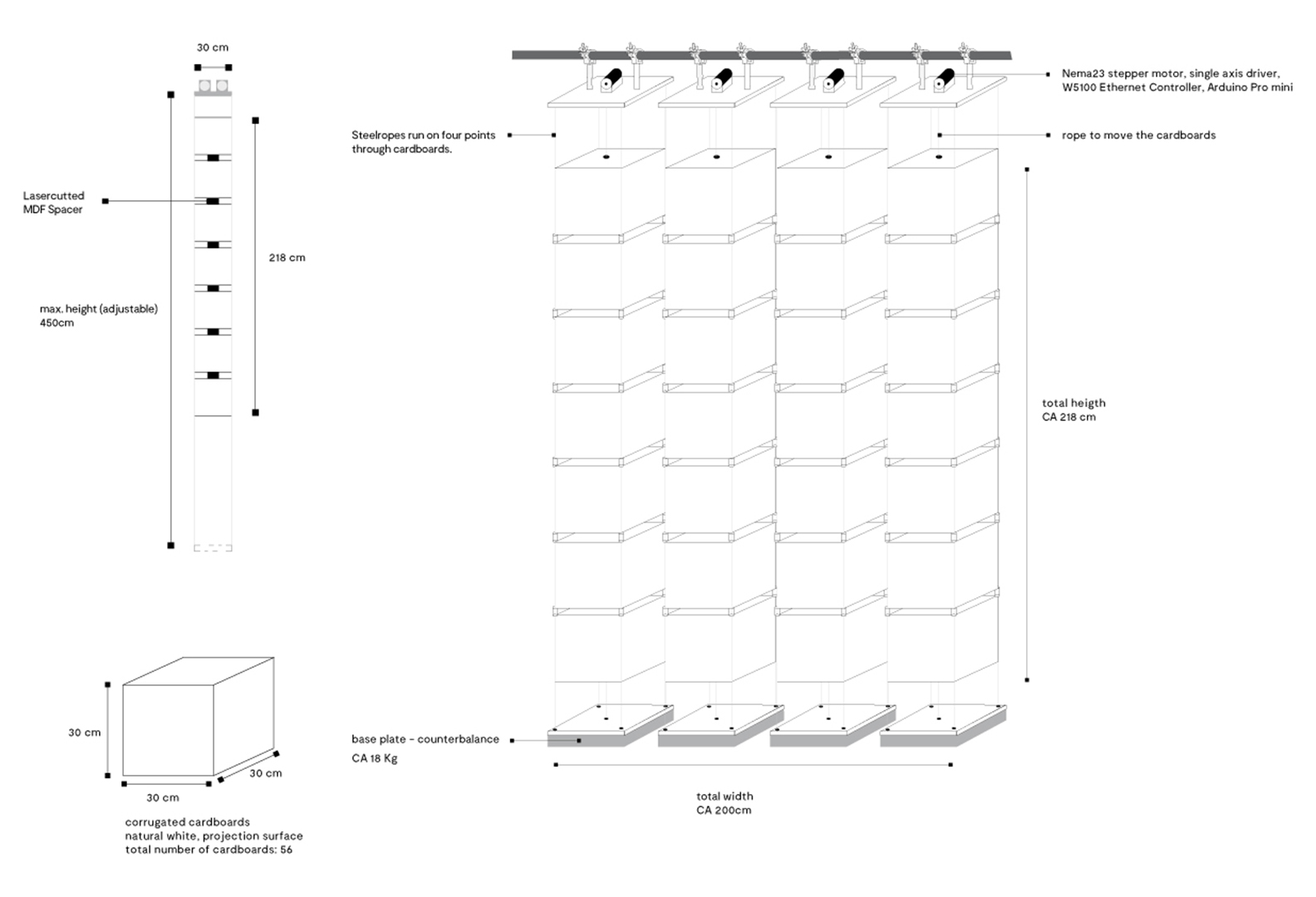 The installation is splitted axisymmetric into two parts. Each part contains 4 rows with 7 cubes dimensioned 30x30 cm. Every column of cubes can be adjusted individually in the y-axis with a stepper motor which is attached to a control plate at the ceiling of the room.