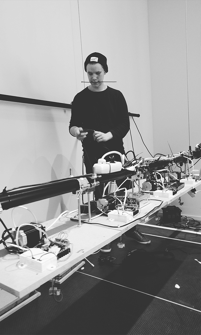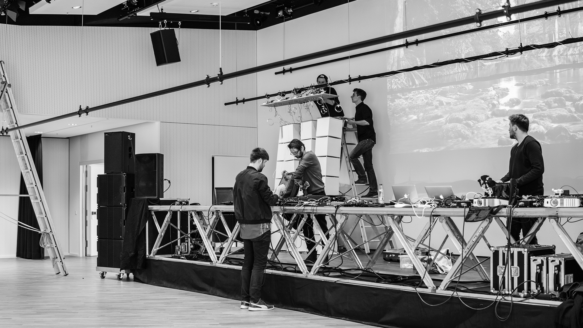 All content even the music, the installation and every visual was created exclusively for this performance. The idea of this project was to create a synergy of all different parts of this performance. The installation is driven by the music as well as by the visuals. The other way round the music is manipulated by the current state of the installation. Each part of the performance affecting each other to unite auditive and visual content to a whole experience.